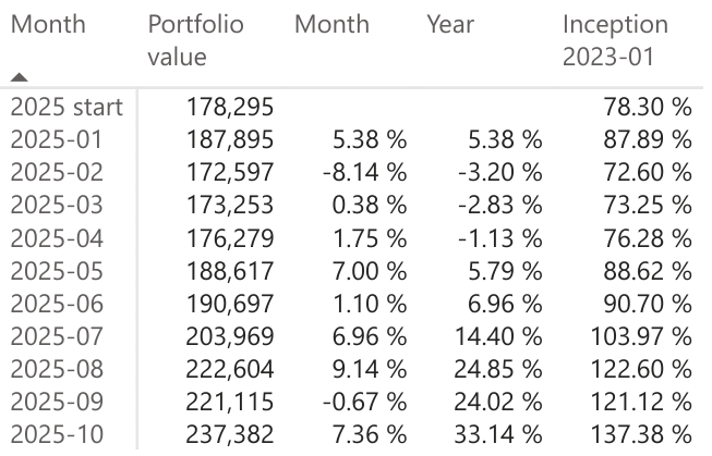 August was another strong month with a gain of 9.14%. September saw a small pullback of 0.67%, followed by a solid recovery in October with a 7.36% increase. Altogether this brings the year-to-date performance to 33.14% and total returns since inception in January 2023 to 137.38%.