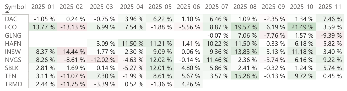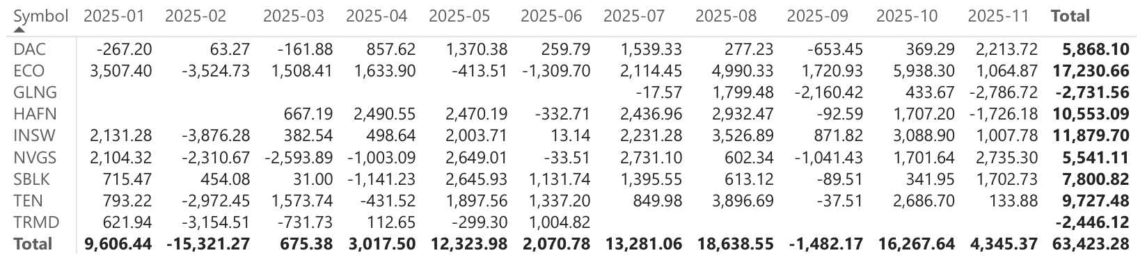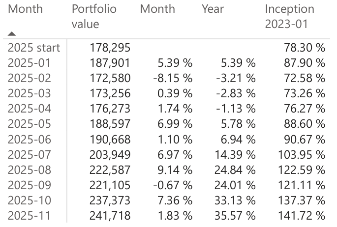 November was a steady month with a gain of 1.83%. Most positions moved in line with expectations, with only HAFN and GLNG showing weaker performance. Despite that, the overall trend remains positive and the portfolio continues to hold up well. This brings the year to date performance to 35.57% and total returns since inception in January 2023 to 141.72%.